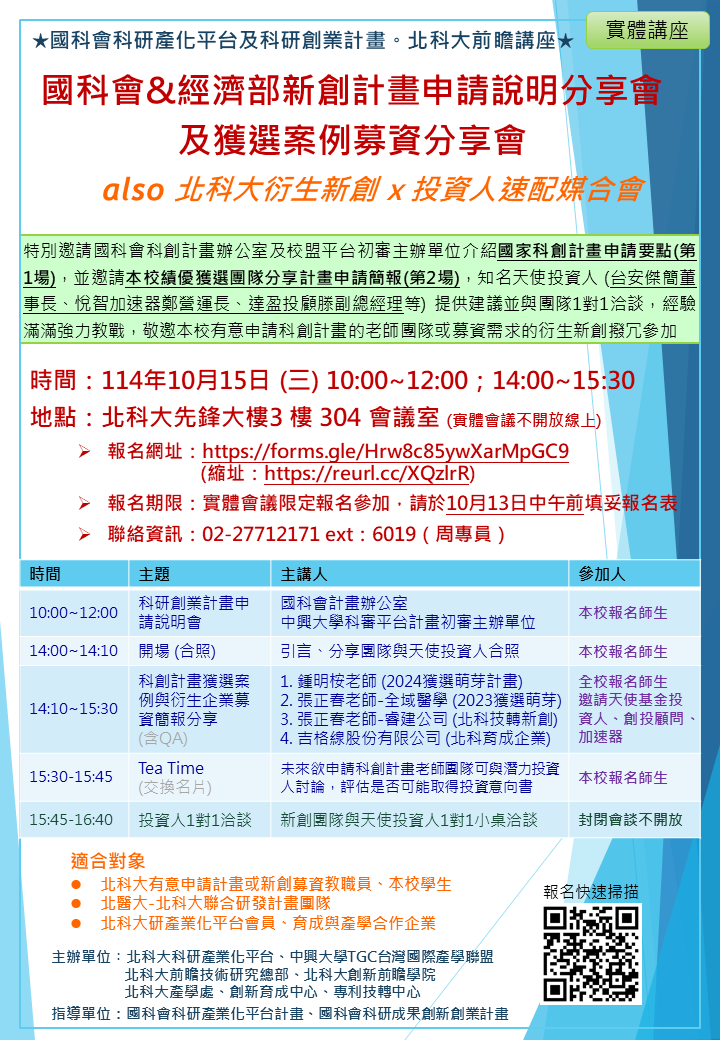 四、適合對象:想瞭解國科會&經濟部科研新創計畫,或對校園衍生新創有興趣的北科大老師/研究室團隊、及北醫-北科聯合研發計畫團隊,歡迎老師研究室團隊報名聆聽。